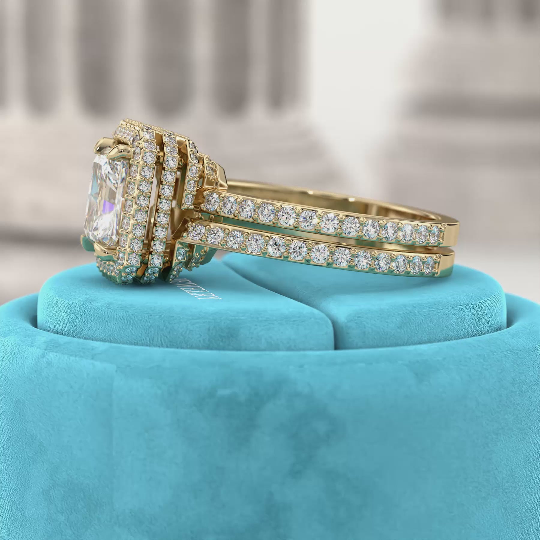 A bold double halo surrounds a radiant-cut lab diamond in this ultra-luxe design. With three rows of diamonds wrapping the band, this piece captures the essence of maximalist glamour. Perfect for those who love making a statement.