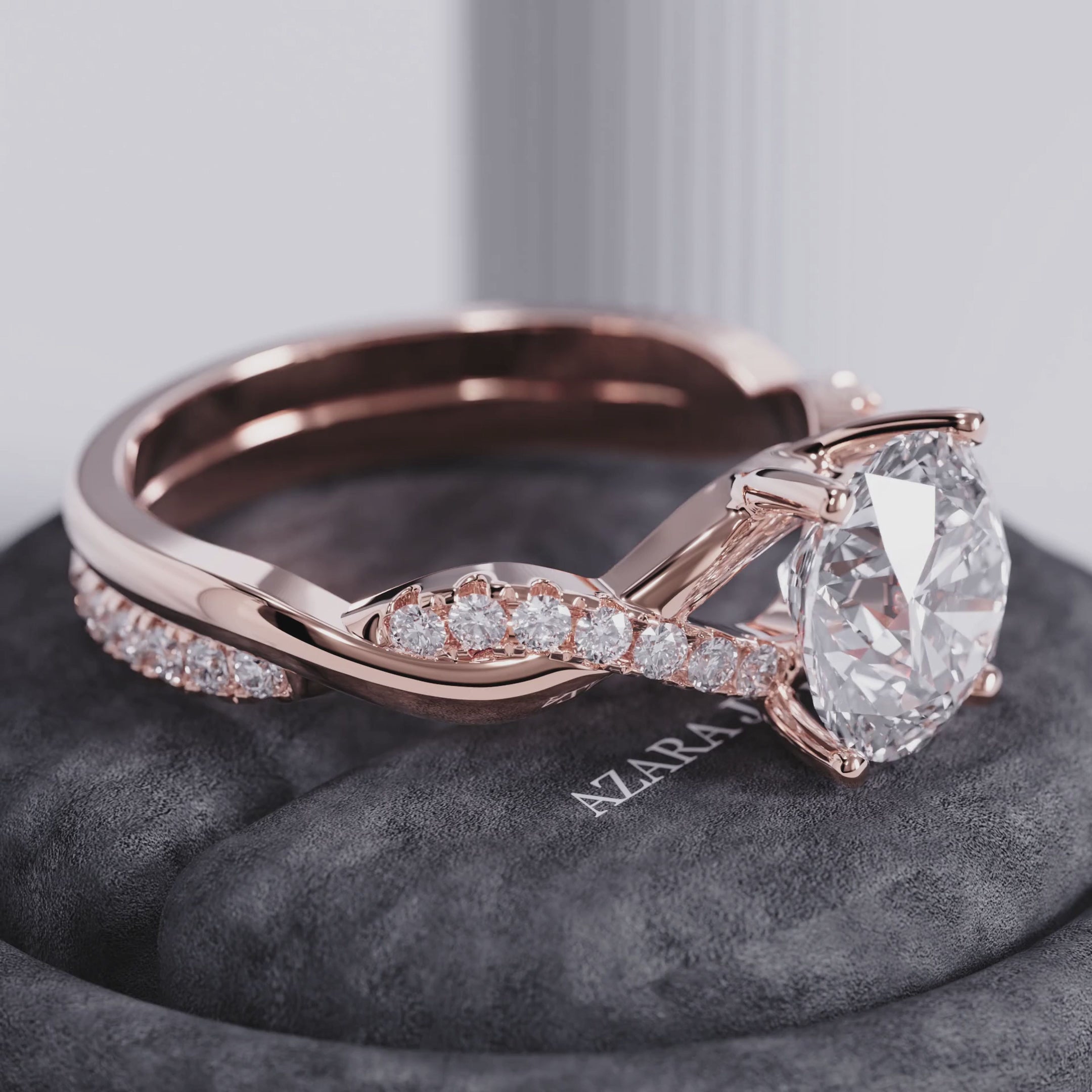 A timeless round brilliant center stone is gracefully cradled by an elegant twisting band, adorned with a cascade of accent stones for added sparkle and dimension.