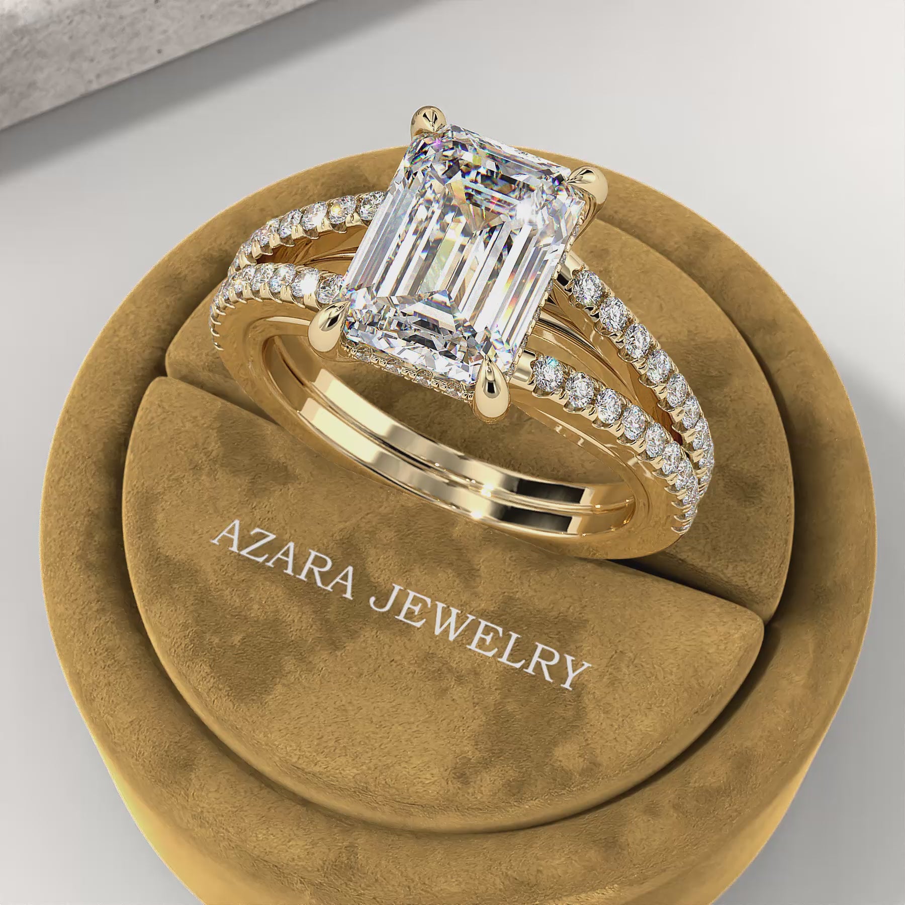 A modern statement with vintage soul, this emerald-cut lab diamond ring features a split shank design lined with pavé diamonds. Its clean, architectural lines highlight the beauty of symmetry and sparkle.