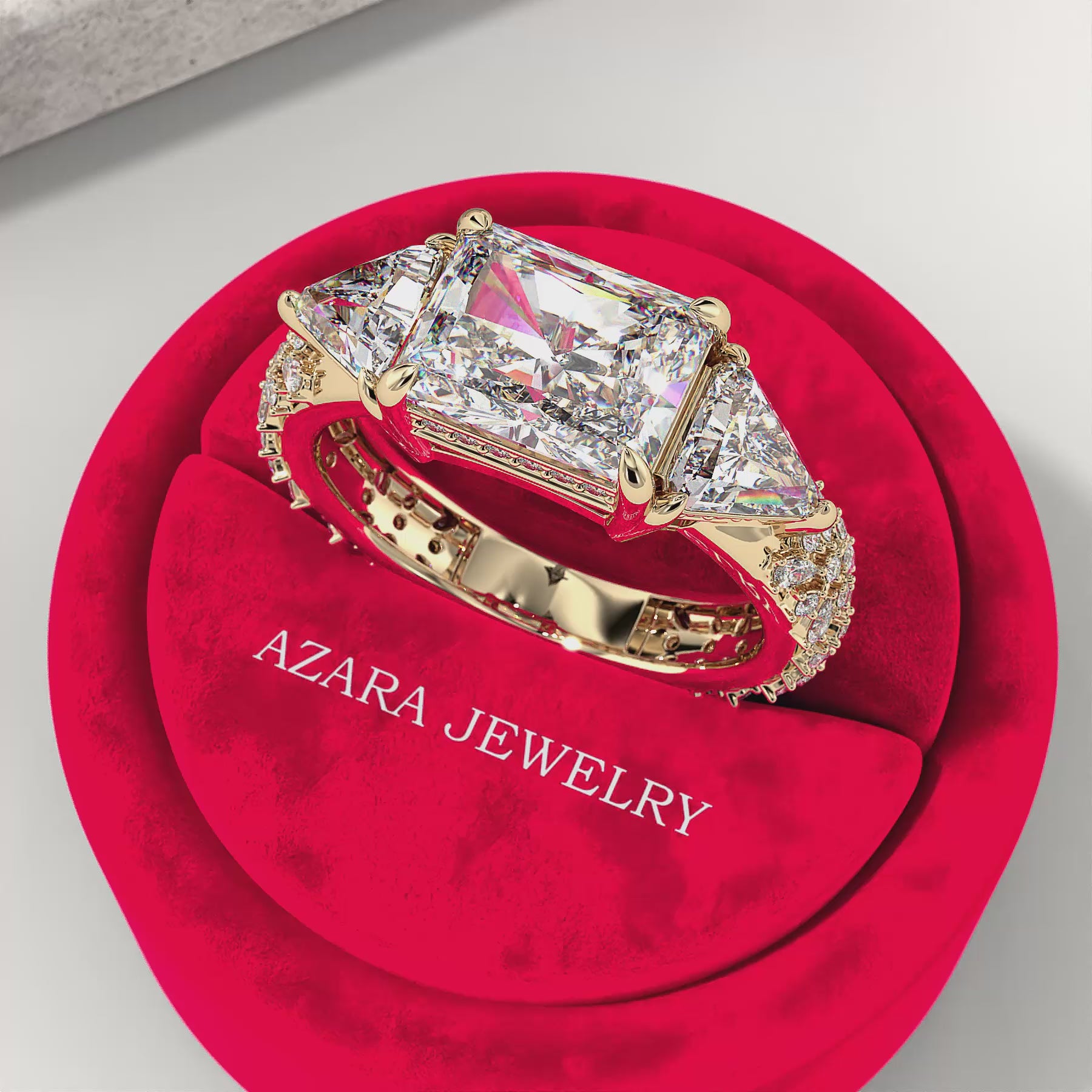 This lab grown radiant cut diamond ring is a bold three-stone design featuring tapered trapezoid side stones and an intricate floral pavé band. The center diamond offers exceptional brilliance and symmetry, while the band is adorned with clusters of marquise and round lab diamonds for a dramatic, sculptural finish. A showstopping piece for those who want high-impact elegance with fine detail.