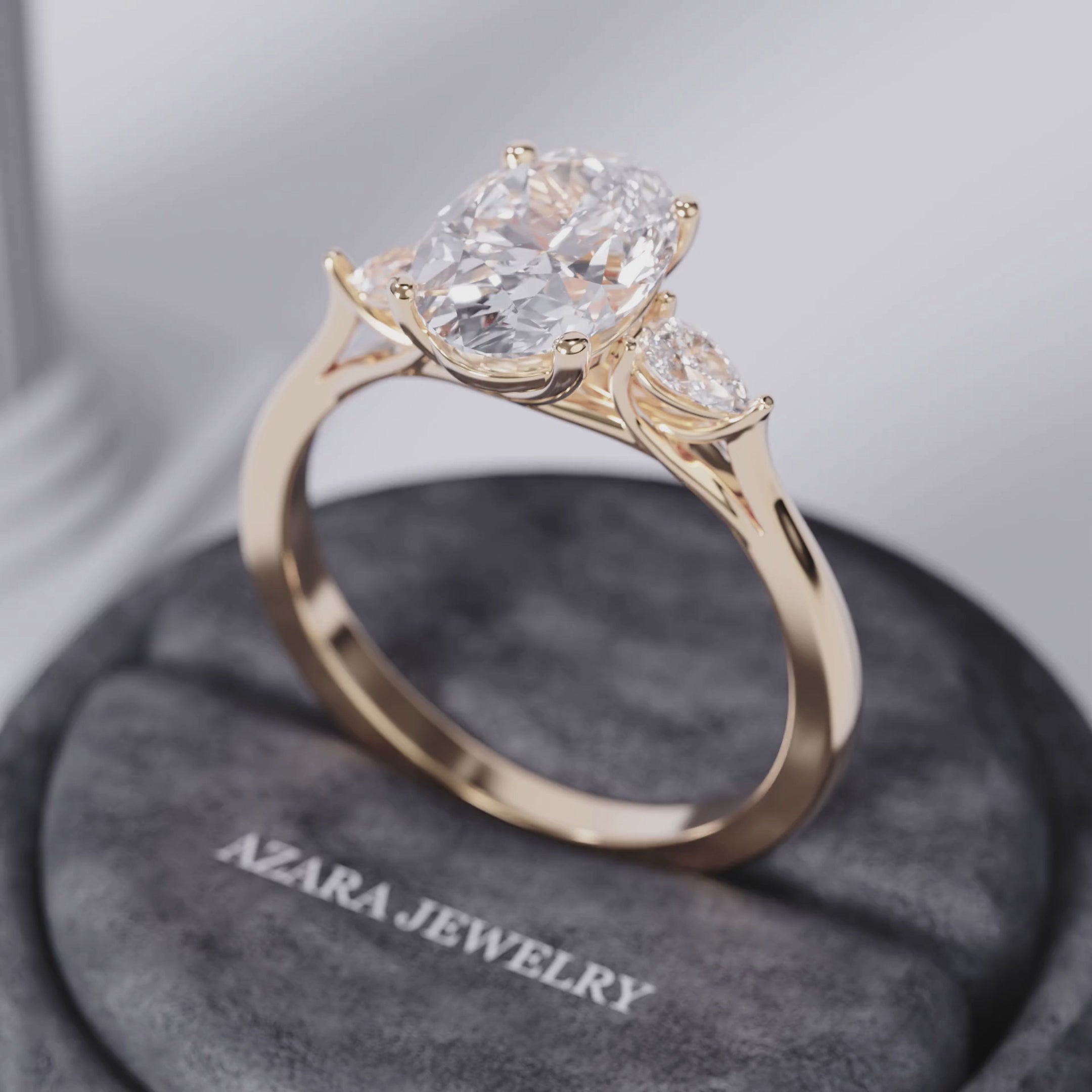 A captivating oval engagement ring featuring a beautifully proportioned center stone flanked by two pear-shaped side diamonds. The setting's open gallery and sculptural undergallery offer a delicate yet artistic silhouette, allowing light to enhance every angle of the lab diamond’s brilliance. Ideal for those seeking an elegant yet unique design with vintage-inspired details.
