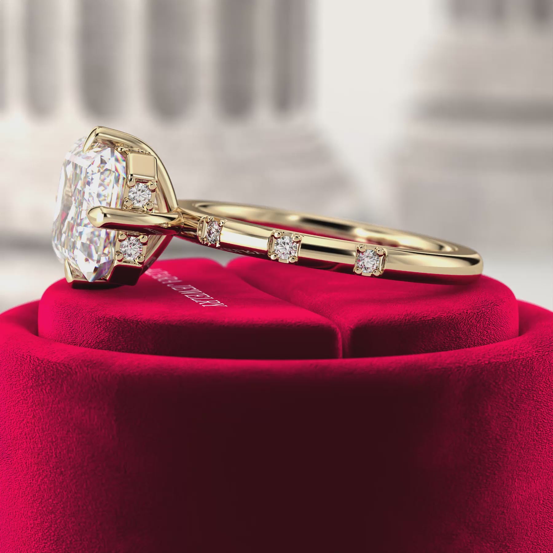 Striking and sophisticated, this emerald-cut lab diamond ring pairs bold brilliance with art deco refinement. Step-cut facets shimmer from every angle, while delicate baguette accents lend architectural elegance. A modern treasure designed for those who seek beauty with presence.