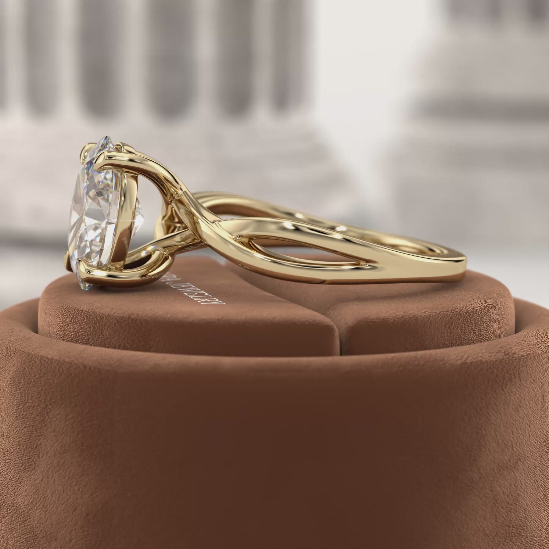 An elegant oval-cut lab diamond sits atop a gracefully twisted band, creating a fluid silhouette that’s both romantic and refined. This piece merges sculptural detail with modern design, perfect for those who appreciate subtle artistry in their engagement ring.