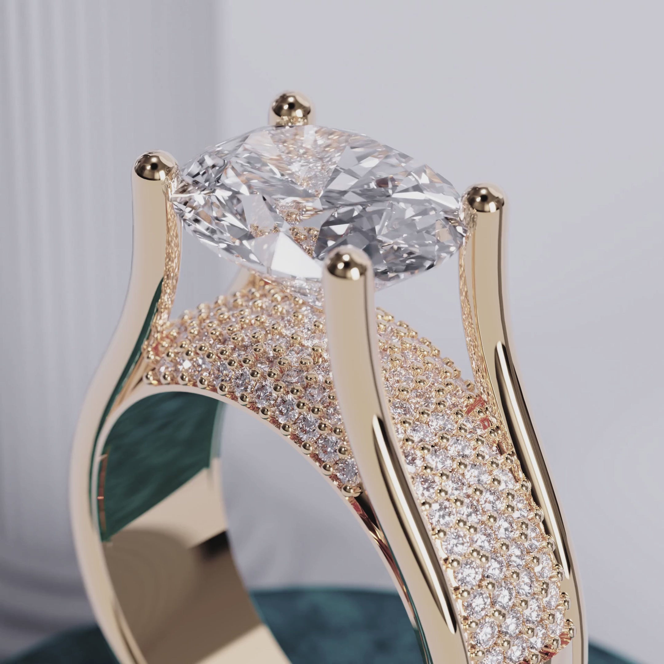 A strikingly bold solitaire engagement ring featuring a high-set oval lab diamond, elevated above a wide band encrusted with pavé stones for maximum sparkle. The split cathedral design draws the eye upward to the centerpiece, creating an architectural silhouette with a modern edge.