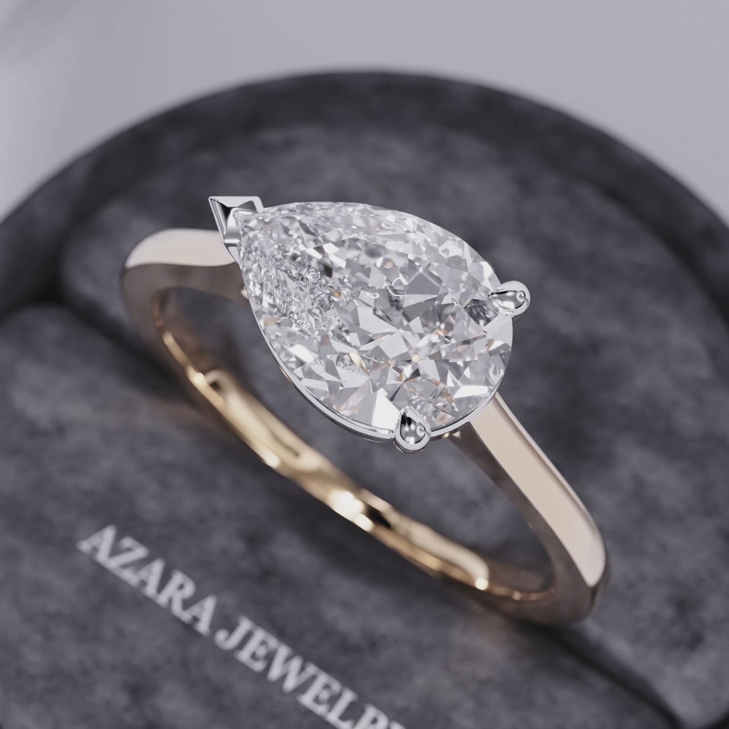 This modern engagement ring features a 2 Carat lab grown pear shaped diamond set in a striking East-West orientation. The sleek prong setting and clean band highlight the brilliance and unique silhouette of the stone—crafted for those who love contemporary elegance with a twist.