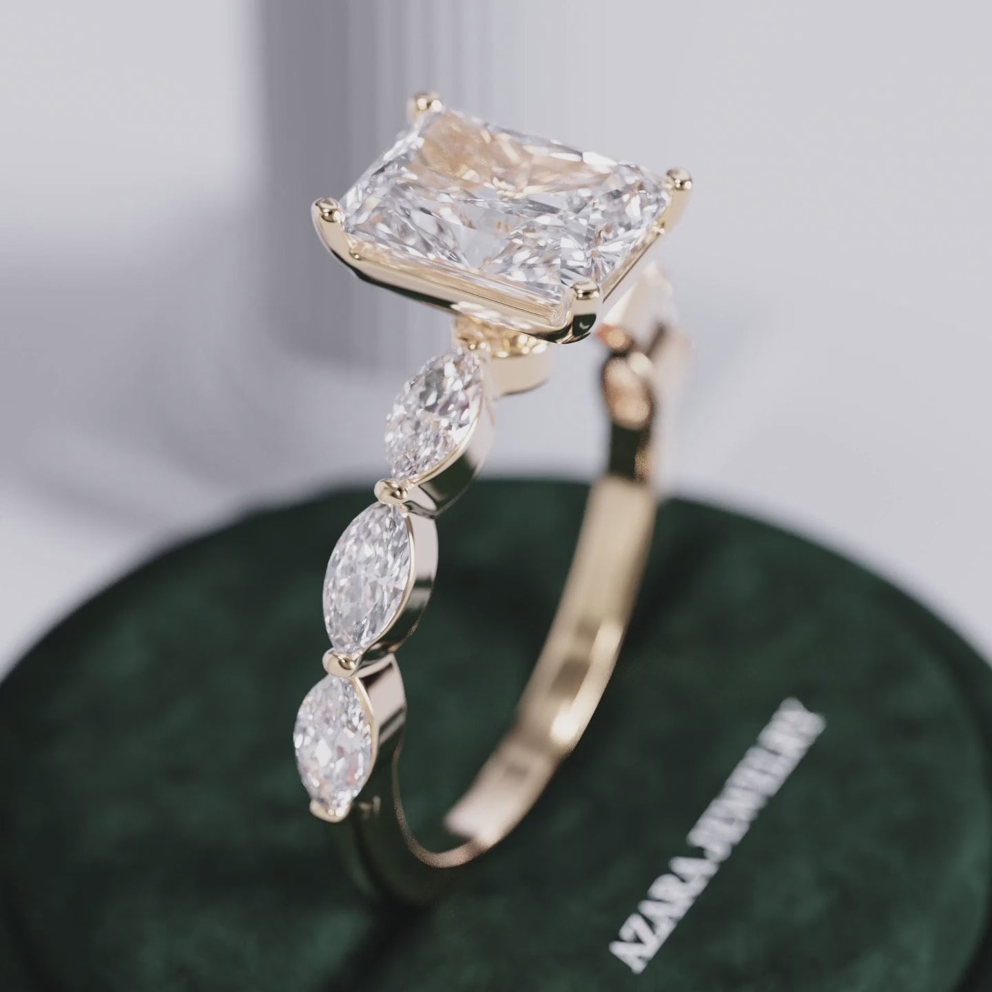 This elegant engagement ring features a radiant cut center diamond set in a secure four-prong setting, accented by horizontally-set marquise diamonds along a polished yellow gold band. A timeless yet modern design, crafted to captivate with brilliance and sophistication.