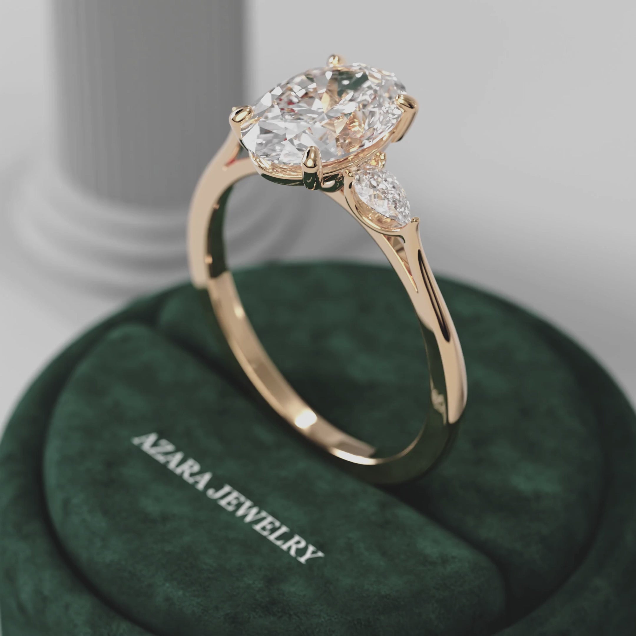 A captivating oval lab diamond takes center stage, flanked by two perfectly matched pear-shaped side stones. Designed with soft curves and a slender band, this timeless silhouette draws the eye with delicate symmetry and graceful elegance.