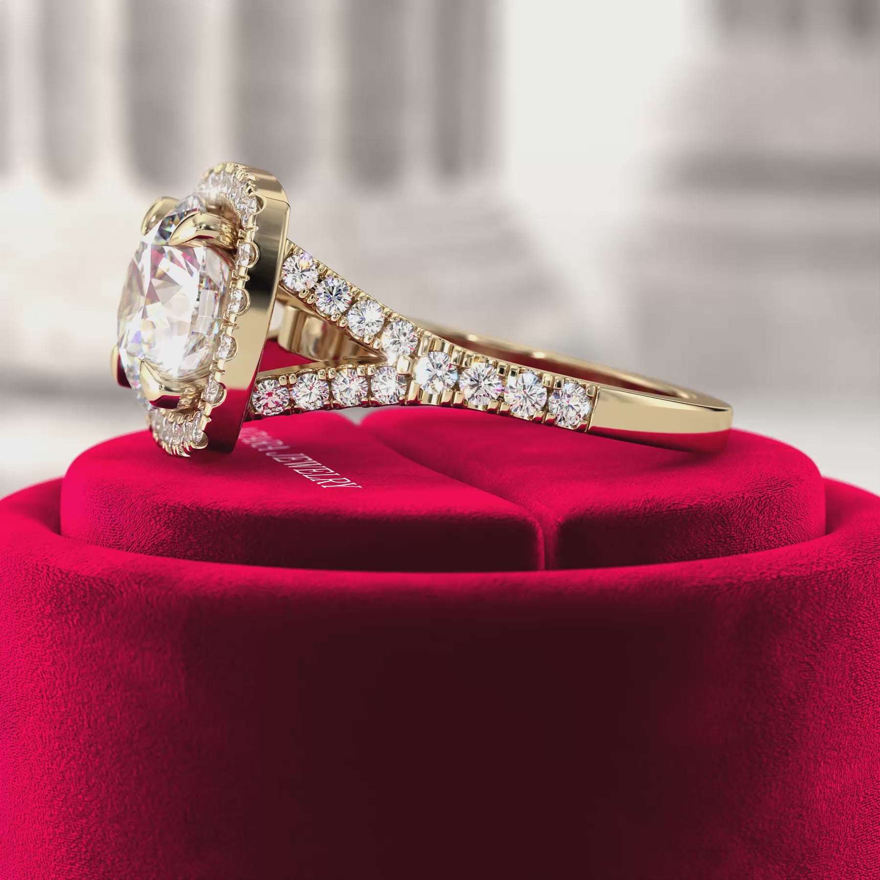 A dazzling celebration of brilliance, this cushion halo design showcases a stunning round lab diamond wrapped in a shimmering frame of pavé stones. Side accents and intricate gallery detailing bring added dimension and sparkle from every angle. Handcrafted for exceptional light performance and timeless elegance.