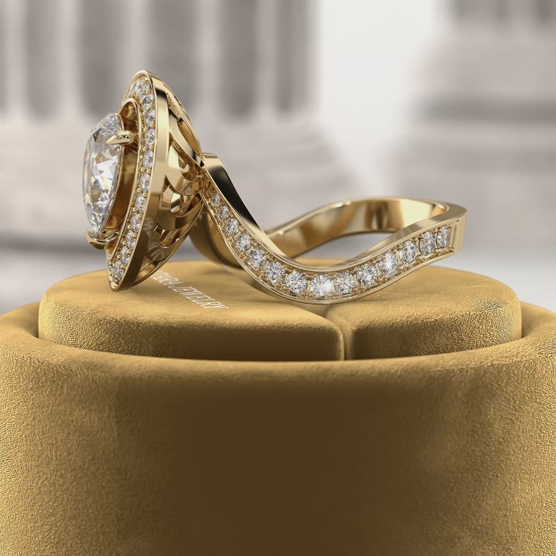 A bold reimagining of the classic teardrop silhouette, this pear-cut lab diamond is framed in a double halo of hand-set accents. The sculptural band curves with intention, merging avant-garde form and elegance.